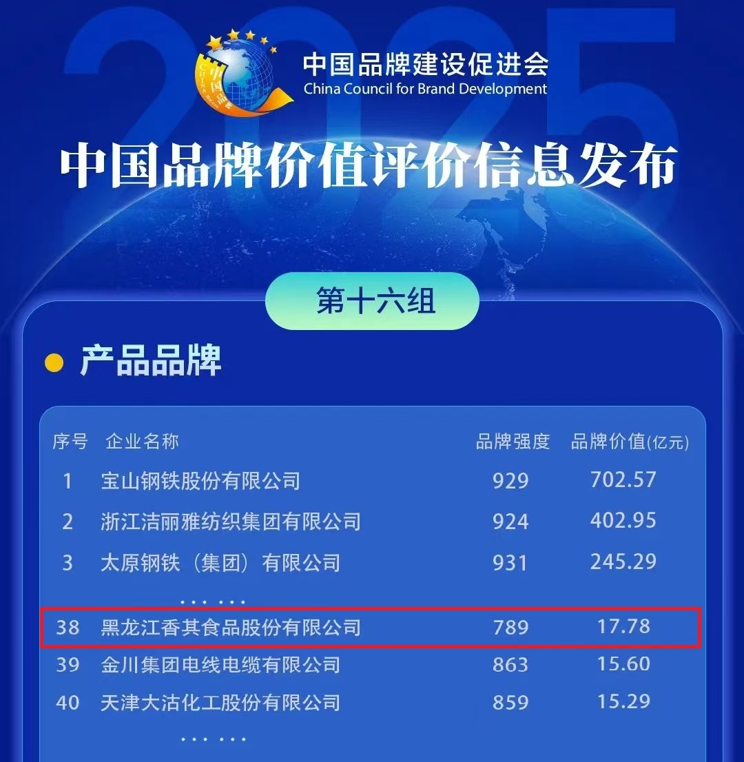 5月10日,由中國品牌建設促進會、中國資產評估協會主辦,新華社品牌工作辦公室、《中國品牌》雜志社等單位承辦的“2025中國品牌價值評價信息”在浙江德清正式發(fā)布。黑龍江香其食品股份有限公司憑借卓越的品牌實力與市場影響力再次榮登榜單,其產品品牌價值飆升至17.78億元,較2024年的14.4億元增長了23.47%,成為食品行業(yè)品牌價值增長的一大亮點。